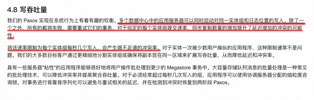 - 2011年,谷歌发布MegaStore论文,其中阐述了将NoSQL和关系数据库结合的事情,将关系数据库架设在BigTable之上,但因其较差的写入吞吐(参考MegaStore论文和Spanner论文,原因截图在后文中),谷歌另起炉灶设计了Spanner。