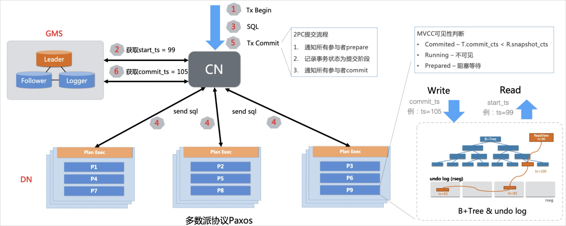 通过引入中心授时服务(TSO),结合多版本并发控制(MVCC),确保读取到一致的快照,而不会读到事务的中间状态。如下图所示,提交事务时,计算节点(CN)执行事务时从TSO获取到时间戳,随着数据一同提交到存储节点(DN)多版本存储引擎上,CN通过读取快照时间戳去DN上读取相应版本的数据。