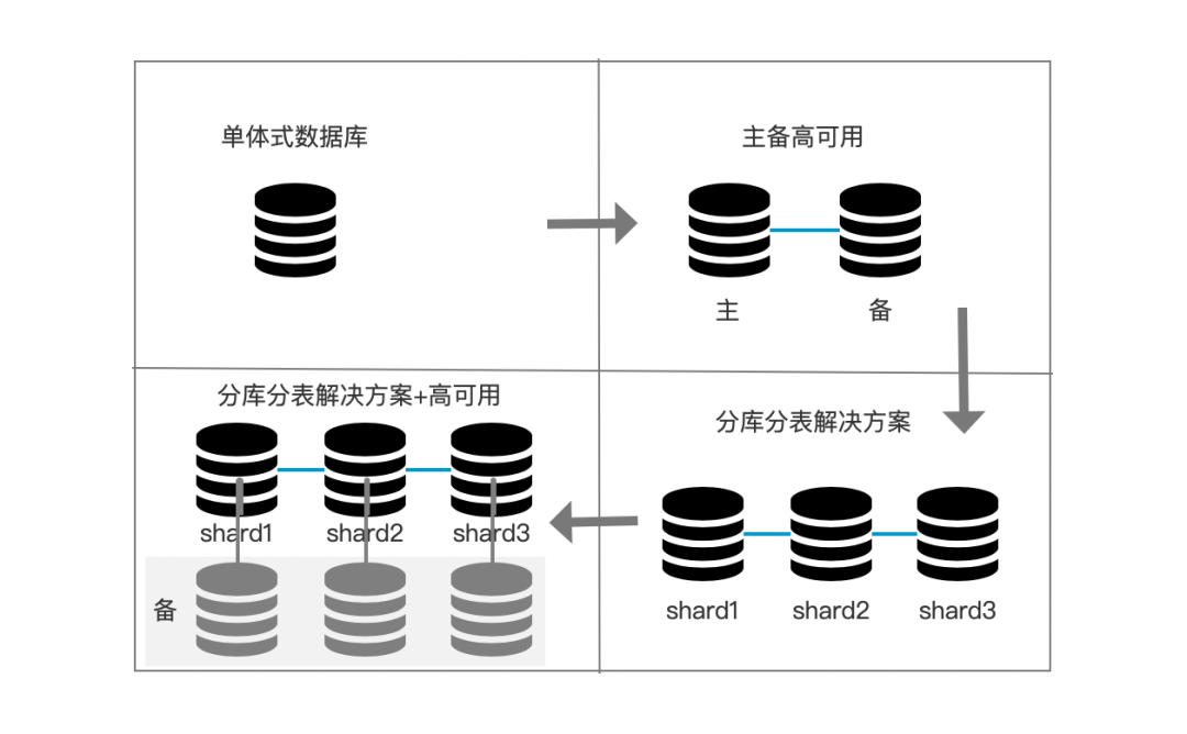 Nosql解决的是海量数据的水平扩展能力和高并发读写能力,但不能很好的支持负责业务场景的海量数据存储问题。一般为了解决复杂业务场景数据(比如交易场景)的海量存储问题,会舍弃传统关系数据库的一些特性(比如范围查询,复杂事务),会采用分库分表的方式来解决。用其他方式(数据仓库)弥补舍弃的能力。 一般的分库分表演进如下,起初是单机数据库,为了高可用会为其增加备库。而为了横向扩展又将数据分库分表存储在多个数据库中,抽象一层建立逻辑上的库表概念。